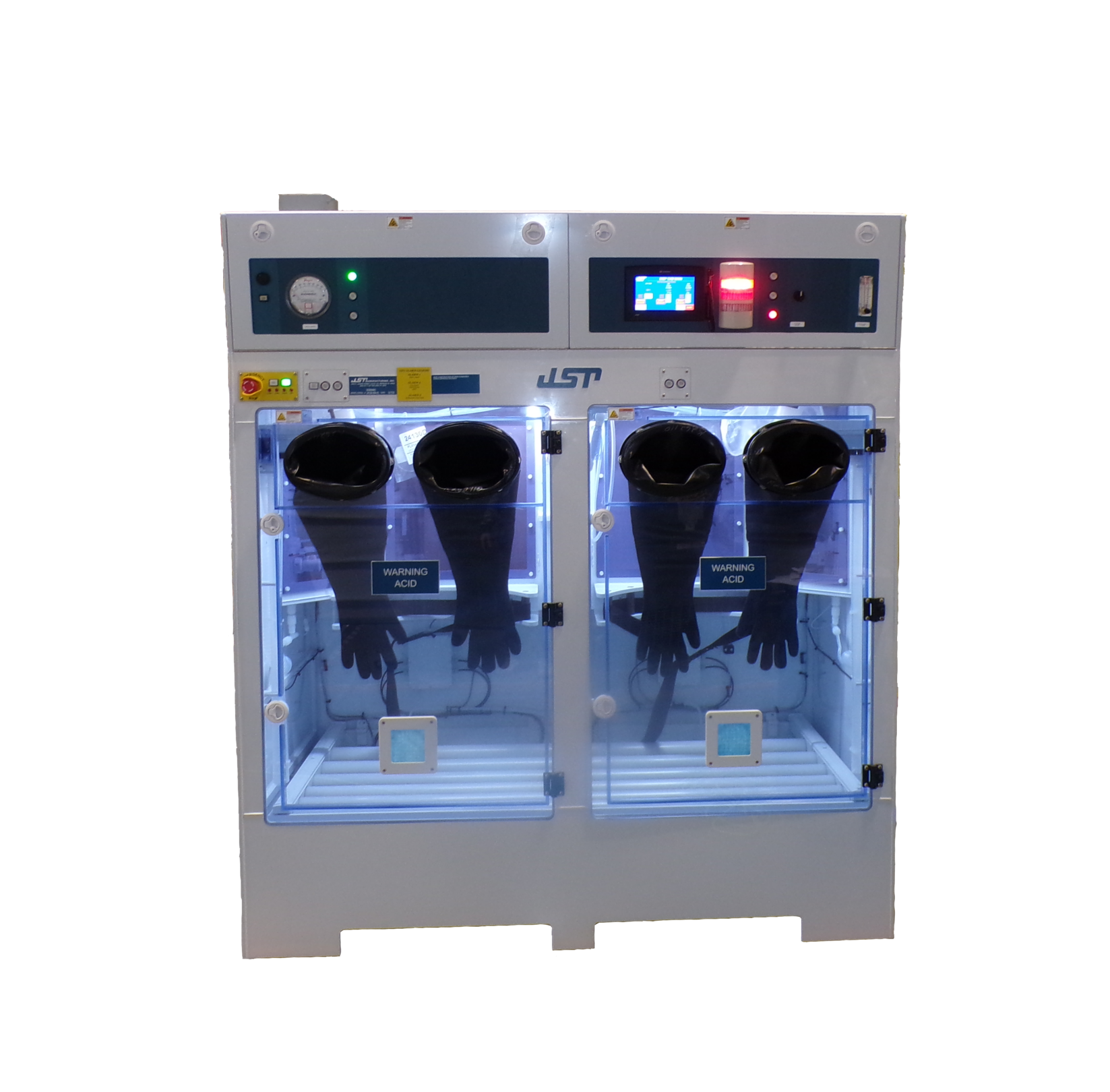 - Glove ports provided in acid or base units